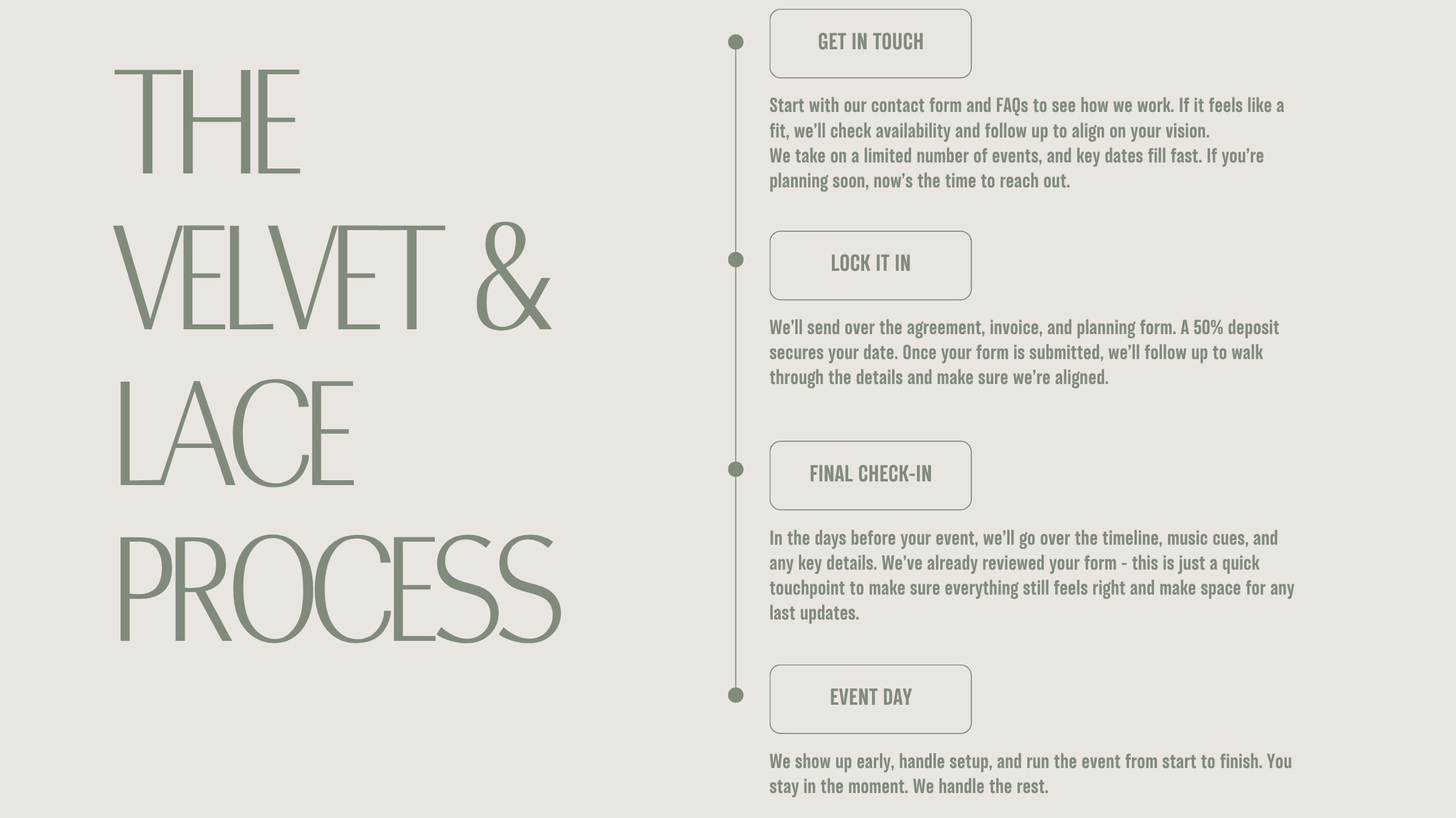 We take on a limited number of events to give each one the attention it deserves. If you're planning something unforgettable like a wedding, private celebration, or brand event - this is where it starts.
